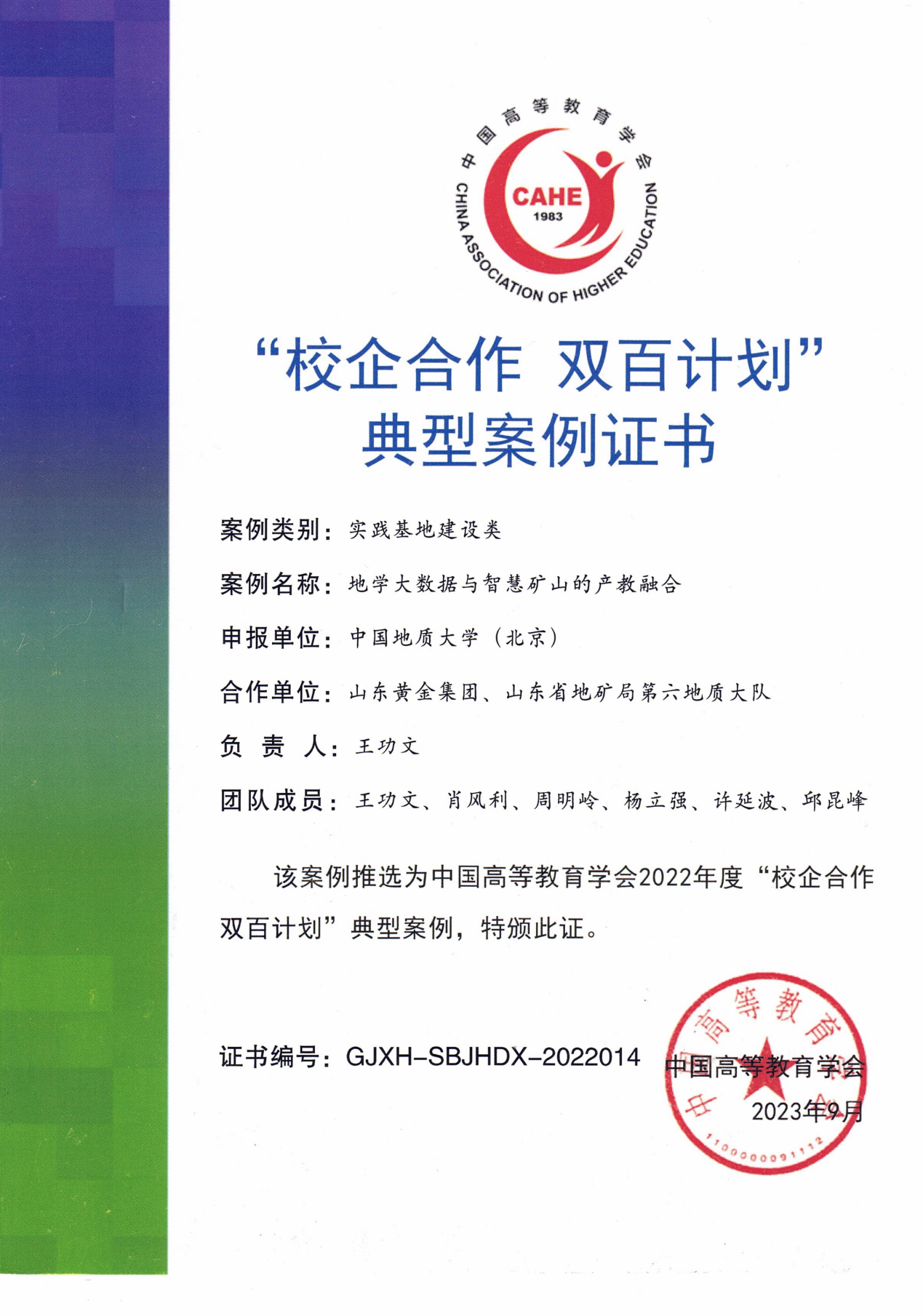2023年,校企合作双百计划,地学大数据与智慧矿山的产教融合,中国高等教育学会