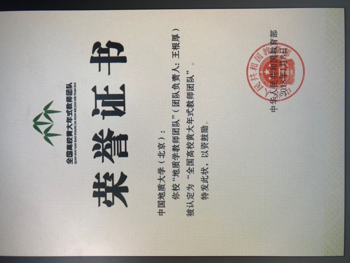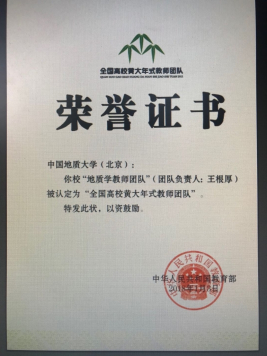 2018年,地质学教学团队获全国高校黄大年式教师团队,中华人民共和国教育部