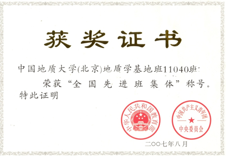 2007 全国先进班集体地质学基地班11040班 国家级 中华人民共和国教育部中国共产主义青年团中央委员会