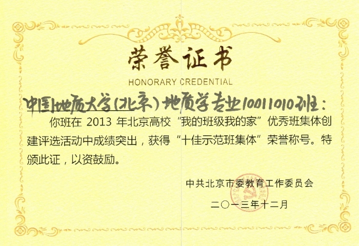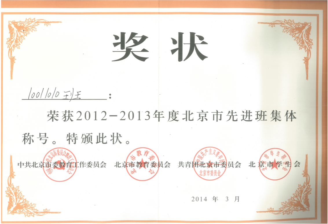 2014 北京市十佳示范班集体-10011010班 北京市级 北京市教工委