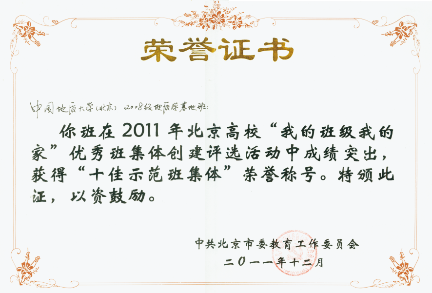 2011 北京市十佳示范班集体-10010810班 北京市级 北京市教工委