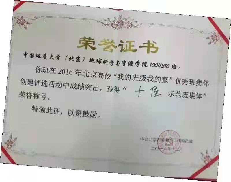 2016 北京市十佳示范班集体-10011310班 北京市级 北京市教工委