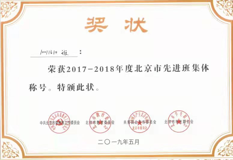 2018 北京市先进班集体-10011610班 北京市级 北京市教工委
