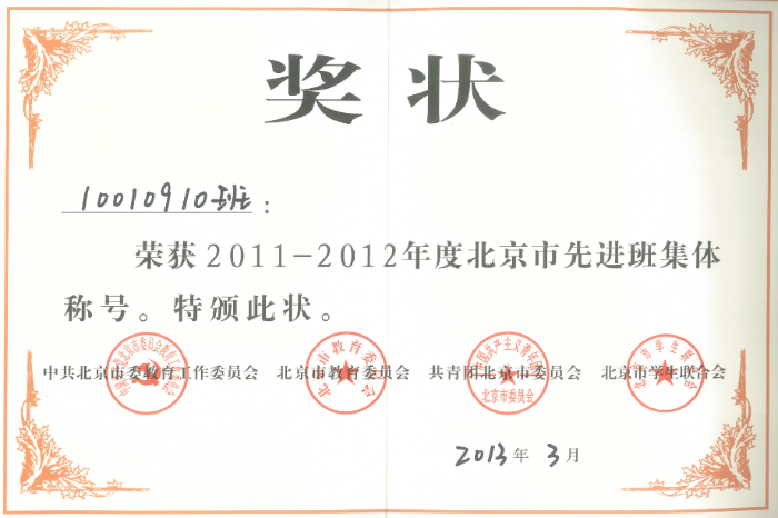 2012 北京市先进班集体—10010910班 北京市级 北京市教工委