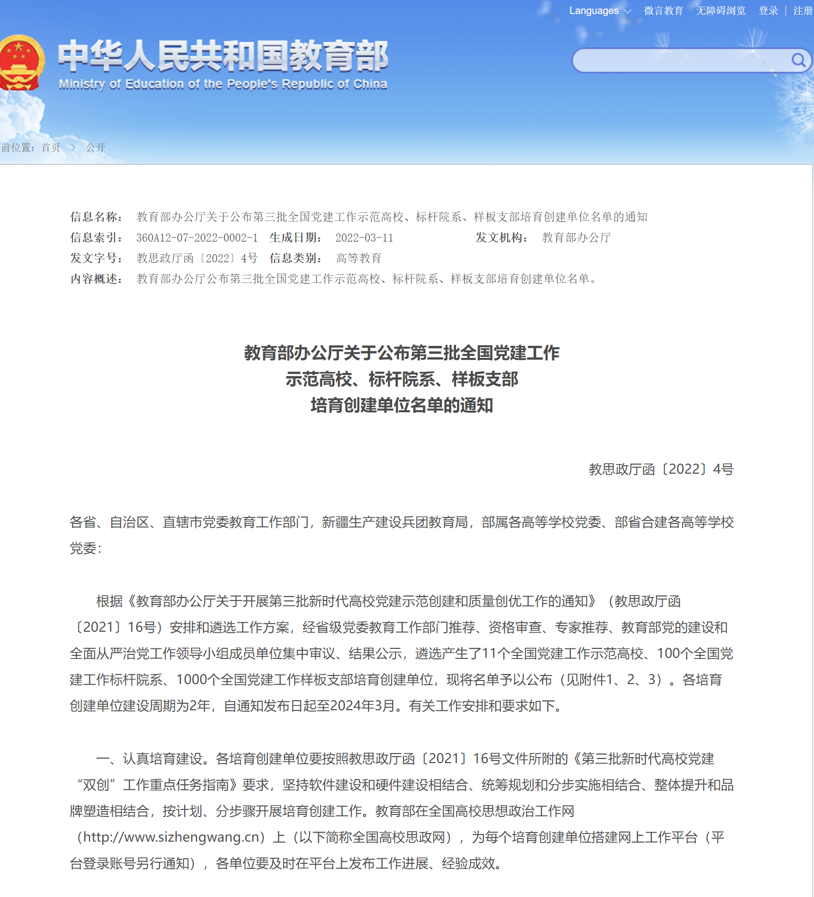 2022年,全国党建标杆院系证明,中华人民共和国教育部