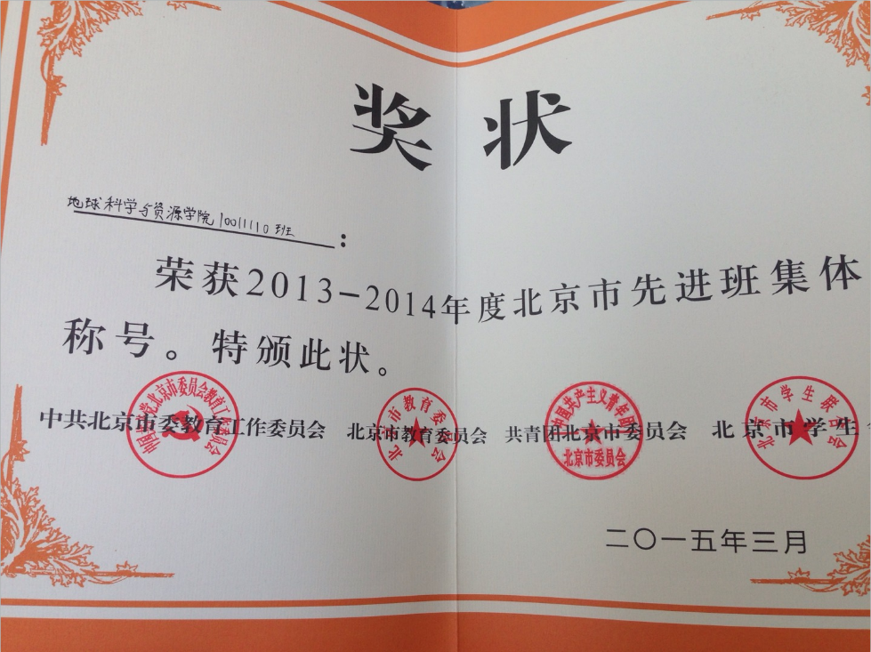 2014 北京市先进班集体-10011010班 北京市级 北京市教工委