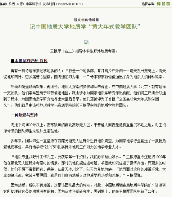 (4)中国科学报(2018年5月10日)报道:薪火相传地质情——记中国地质大学(北京)地质学“黄大年式教师团队”