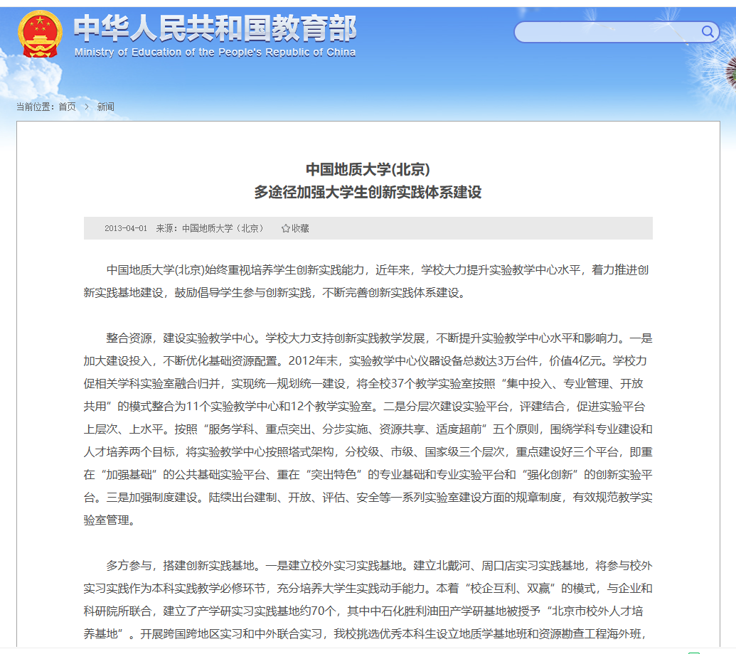 (2)教育部网站(2013年4月1日):中国地质大学(北京)多途径加强大学生创新实践体系建设