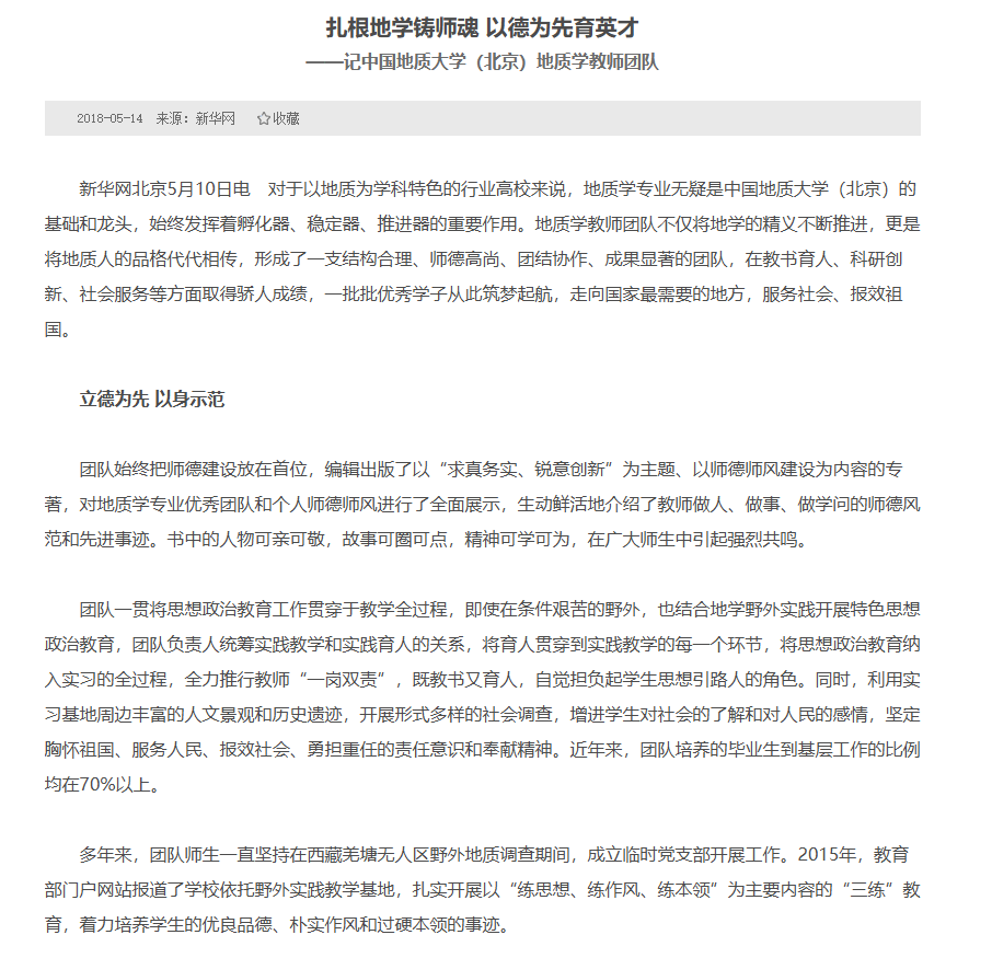 (6)新华网(2018年5月10日)、教育部网站转载(2018年5月14日)报道:扎根地学铸师魂 以德为先育英才——记中国地质大学(北京)地质学教师团队http://www.moe.gov.cn/jyb_xwfb/xw_zt/moe_357/jyzt_2018n/2018_zt02/zt1802_mtbd/201805/t20180514_335832.html