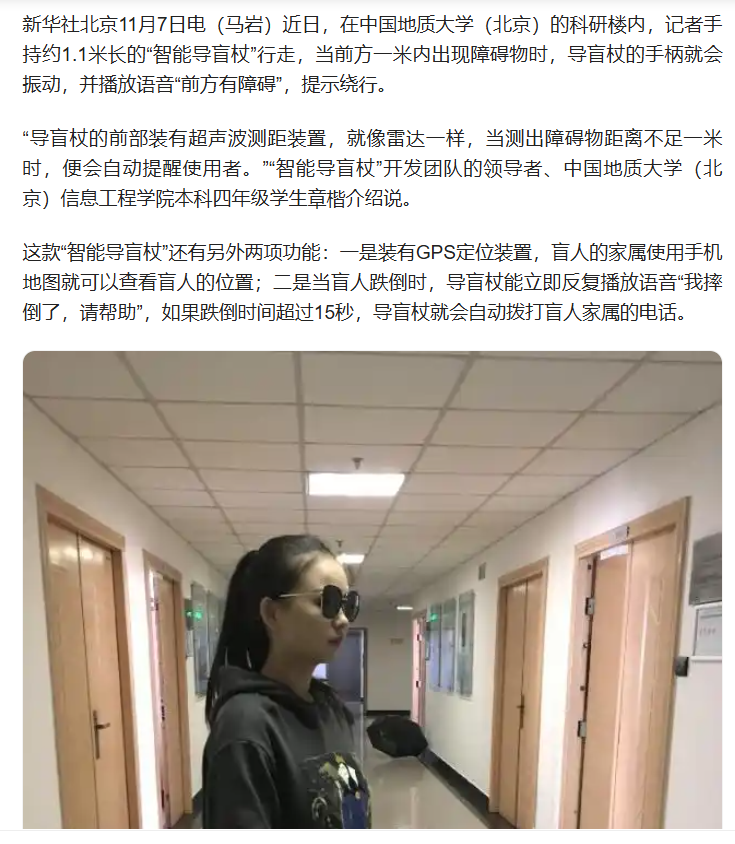 (7)新华社(2018年11月7日):中国大学生研发“智能导盲杖”