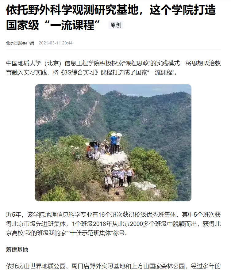 (8)北京日报客户端(2021年3月11日)报道:依托野外科学观测研究基地,这个学院打造国家级“一流课程”