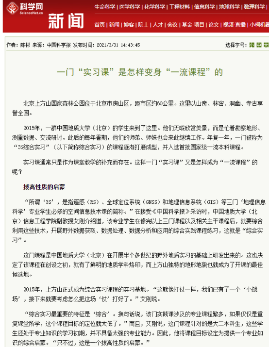 (9)中国科学报(2021年3月31日)报道:一门“实习课”是怎样变身“一流课程”的—新闻—科学网