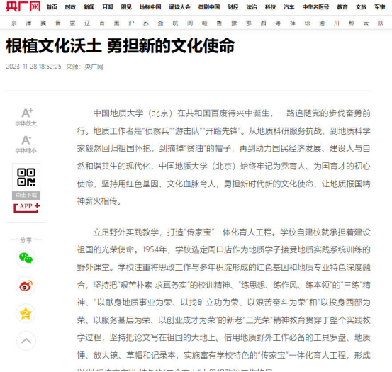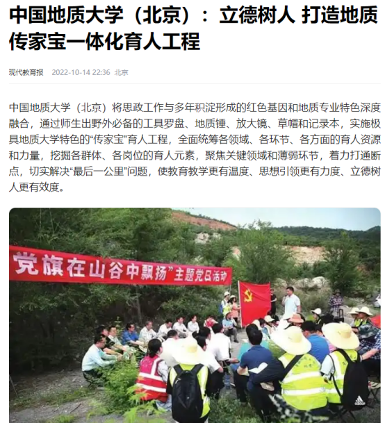 (10)现代教育报(2022年10月14日)报道:中国地质大学(北京):立德树人 打造地质传家宝一体化育人工程播报文章