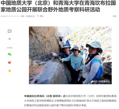 (12)中国通讯社(2023年7月10日):中国地质大学(北京)和青海大学在青海坎布拉国家地质公园开展联合野外地质考察科研活动