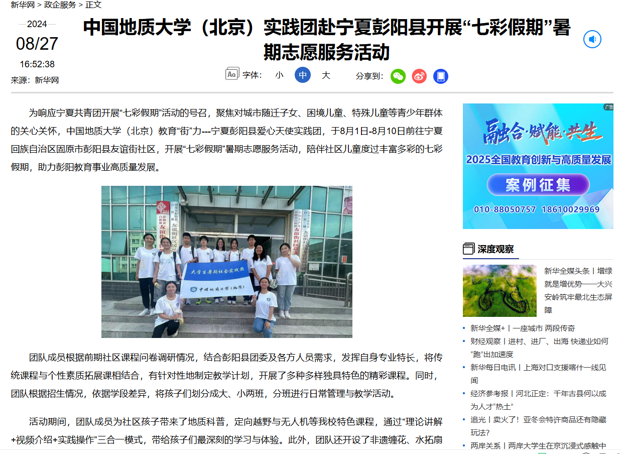 (23)新华网(2024年8月27日):中国地质大学(北京)实践团赴宁夏彭阳县开展“七彩假期”暑期志愿服务活动