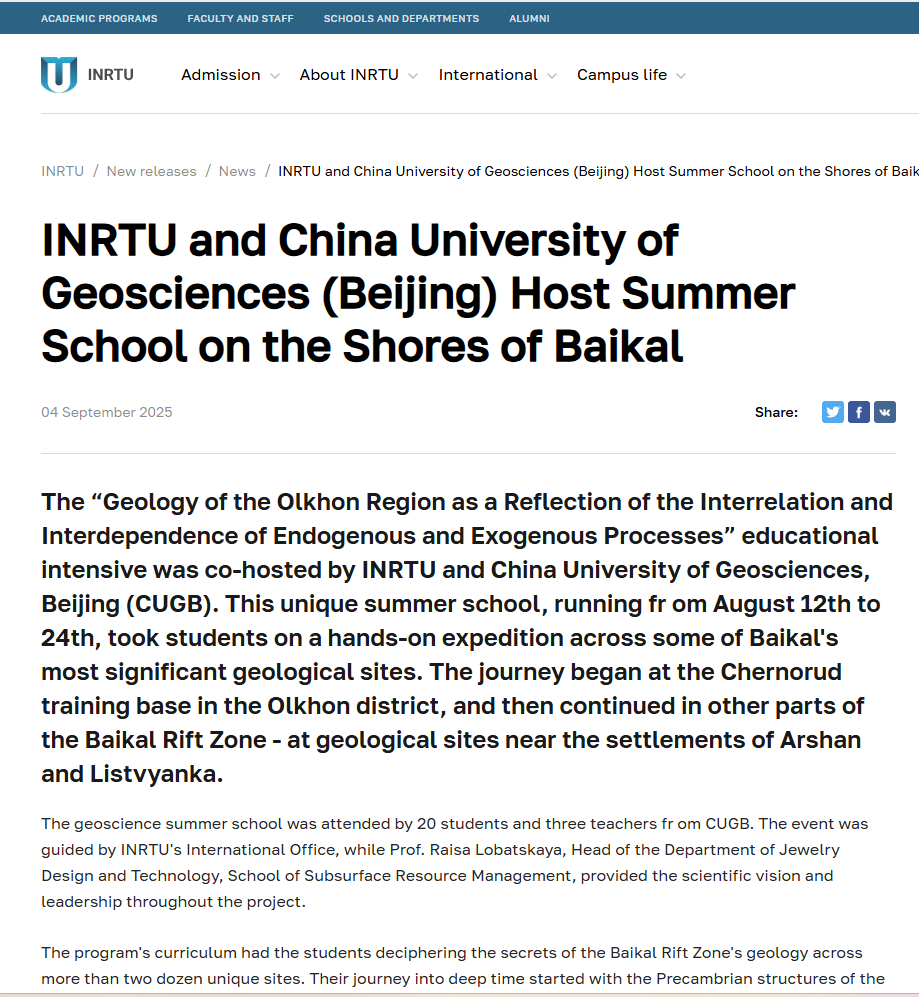 (24)伊尔库茨克国立理工大学主页(2025年9月4日):伊尔库茨克国立理工大学与中国地质大学(北京)举办贝加尔湖暑期学校
