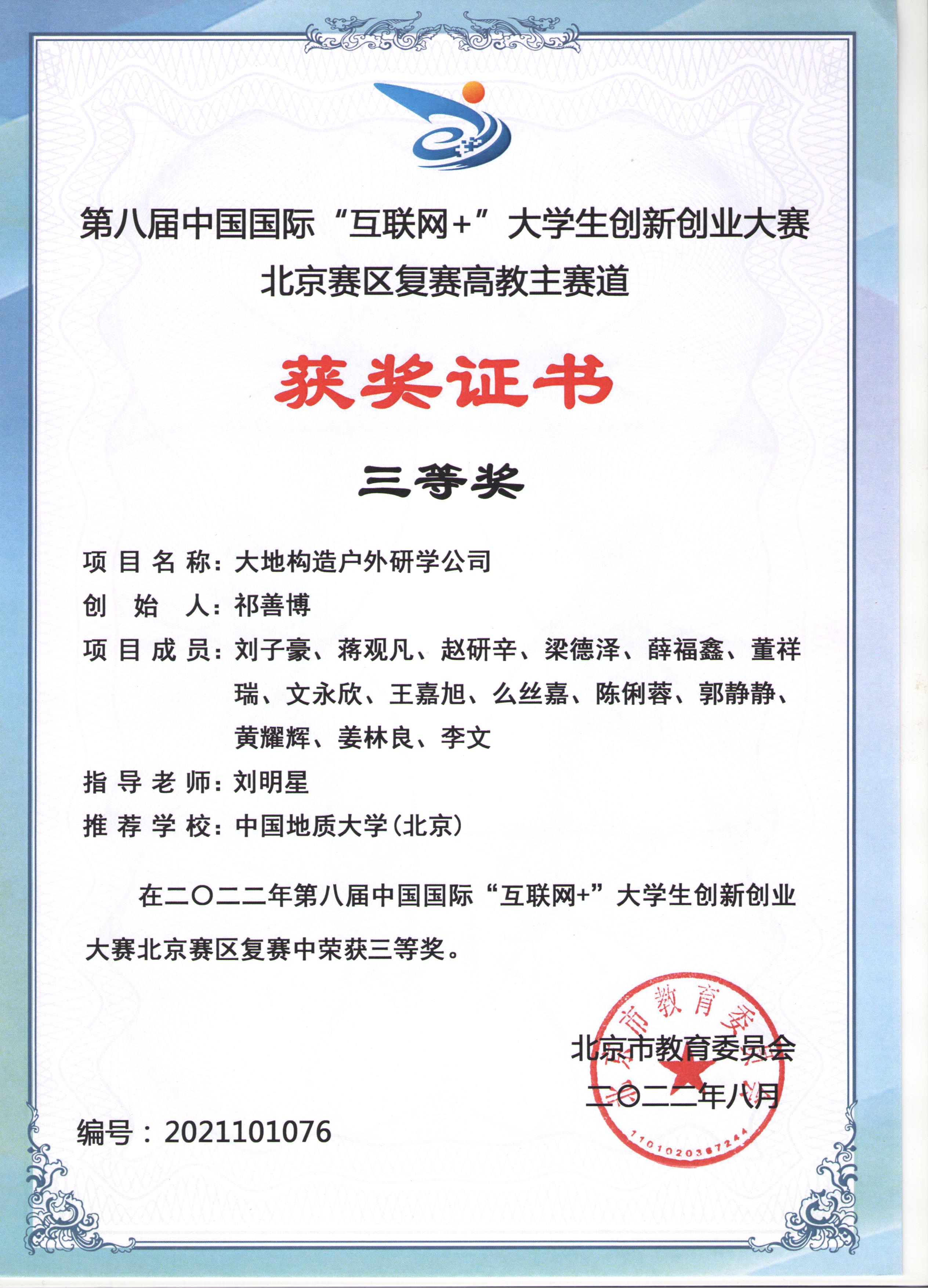 2022年第八届中国国际“互联网+”大学生创新创业大赛北京赛区复赛高教主赛道三等奖(1)