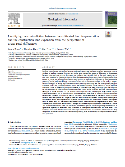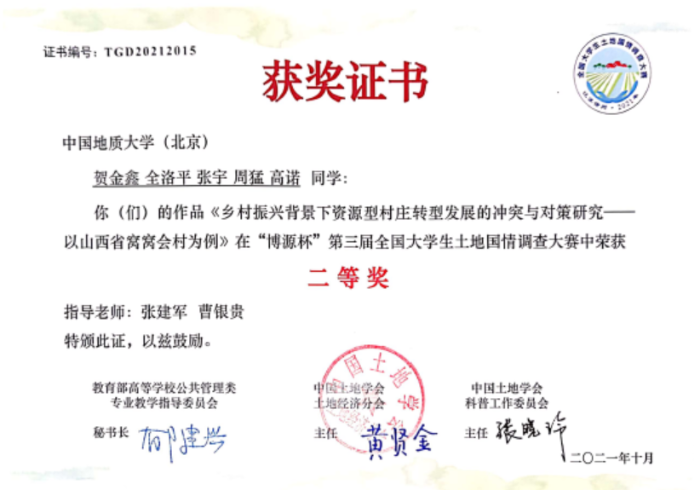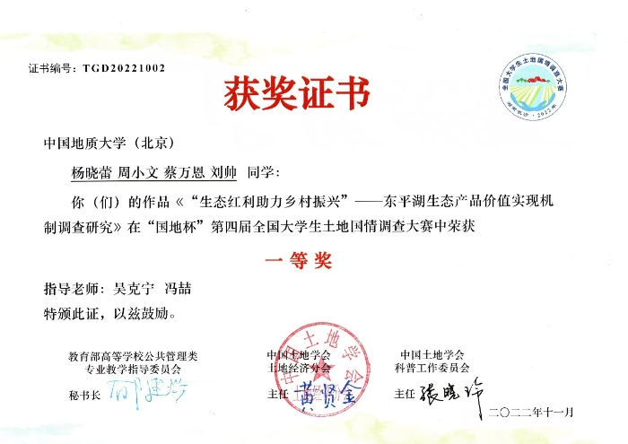 27、第四届全国大学生土地国情调查大赛,一等奖;指导教师:吴克宁,冯喆,2022.11