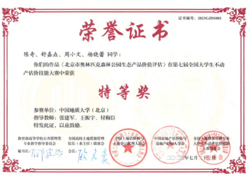 21、第七届全国大学生不动产估价技能大赛,特等奖;指导教师:张建军、王振宇、付梅臣,2024.08