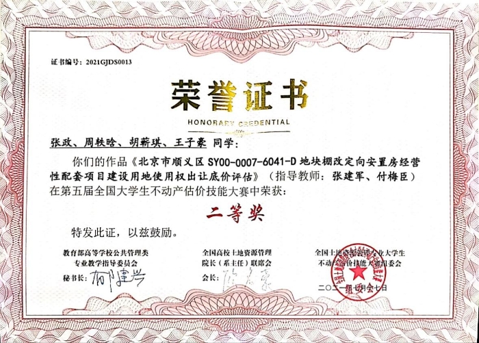 32、第五届全国大学生不动产估价技能大赛,二等奖;指导教师:张建军、付梅臣,2021.07
