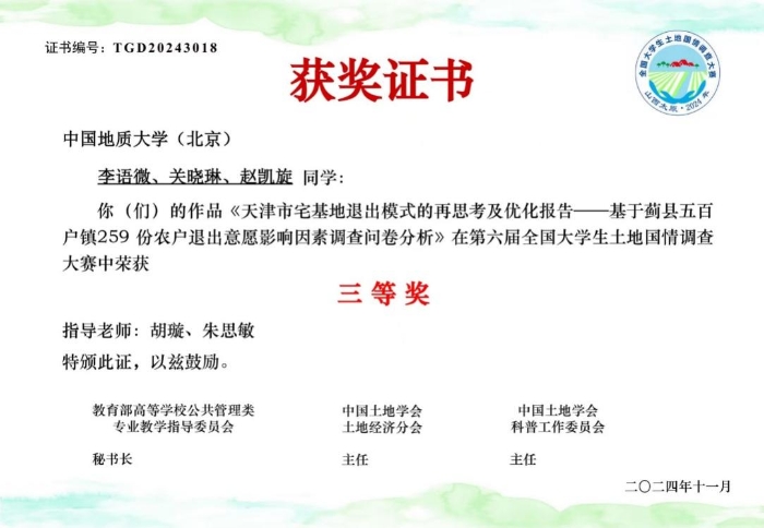 23、第六届全国大学生土地国情调查大赛,三等奖:指导教师:胡璇,2024.11