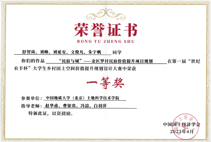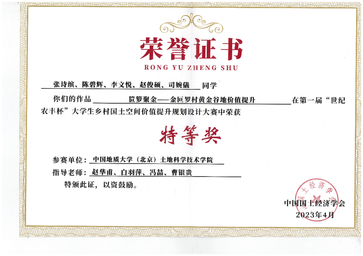25、第一届“世纪农丰杯” 首都大学生乡村国土空间价值提升规划设计大赛,特等奖;指导教师:赵华甫、白羽萍、冯喆、曹银贵,2023.04