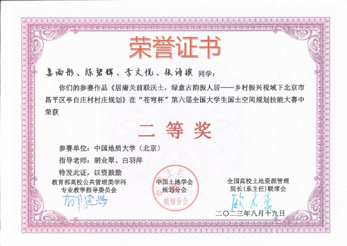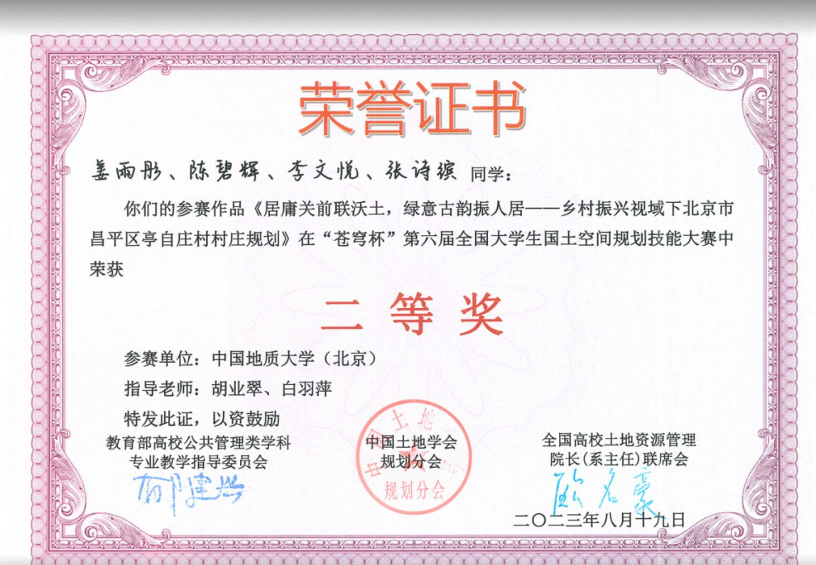 18、第六届全国国土空间规划技能大赛,二等奖;指导教师:胡业翠,白羽萍,2023.8