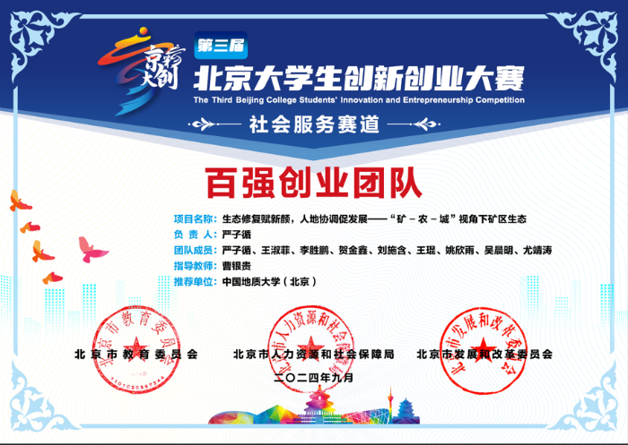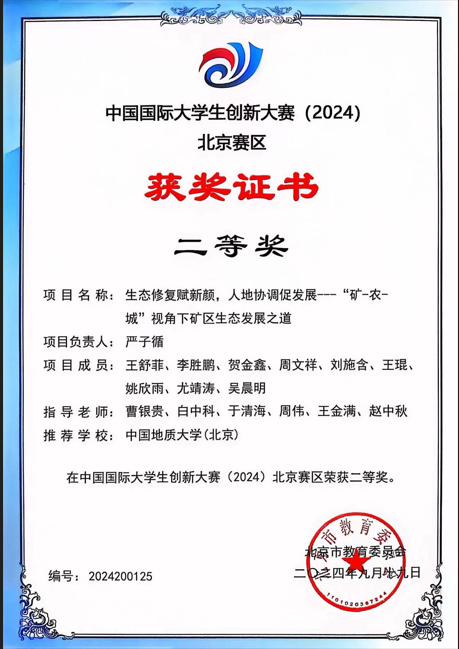 20、中国国际大学生创新大赛北京赛区,二等奖;指导教师:曹银贵,白中科,周伟,王金满、赵中秋,2024.09