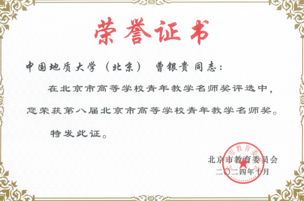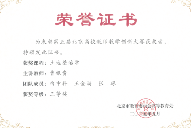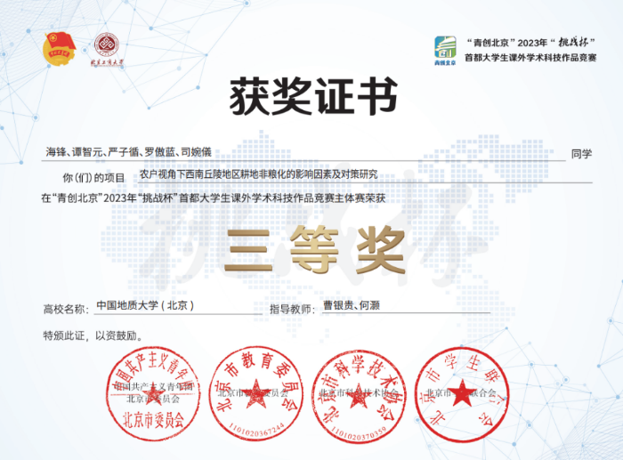 5、“青创北京”2023年“挑战杯”首都大学生课外学术科技作品主体赛,三等奖;指导教师:曹银贵,2024.09