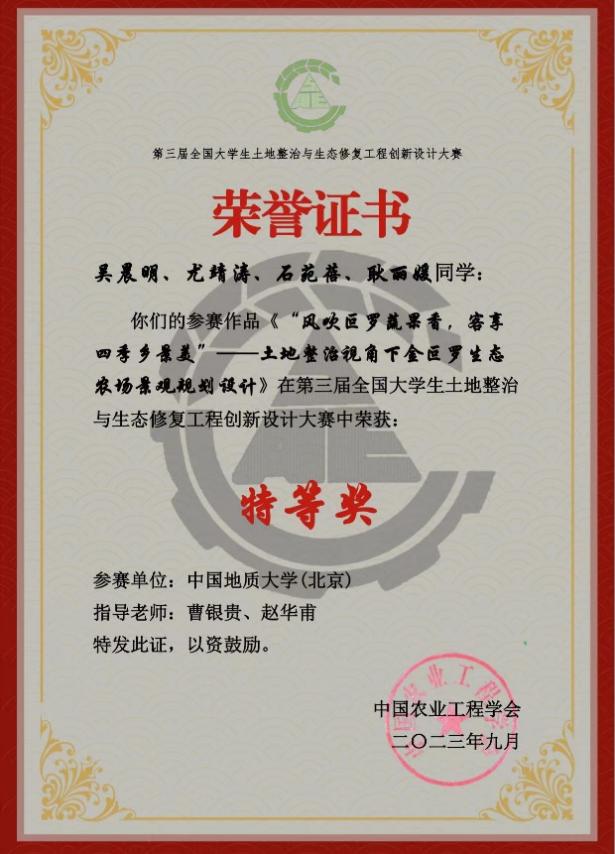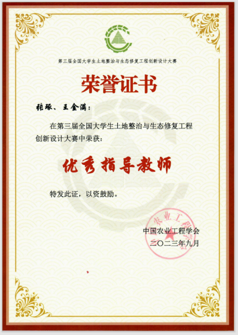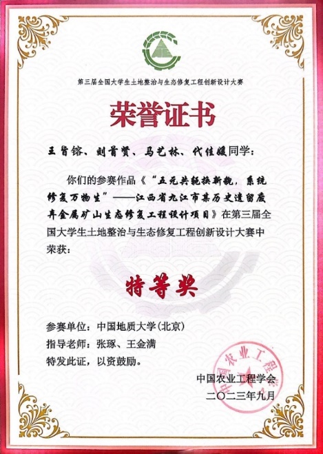 9、第三届全国大学生土地整治与生态修复工程创新设计大赛,特等奖;指导教师:张琢、王金满,2023.09