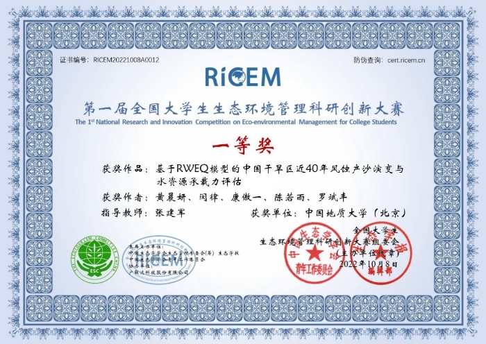 28、第一届全国大学生生态环境管理科研创新大赛,一等奖;指导教师:张建军,2022.10
