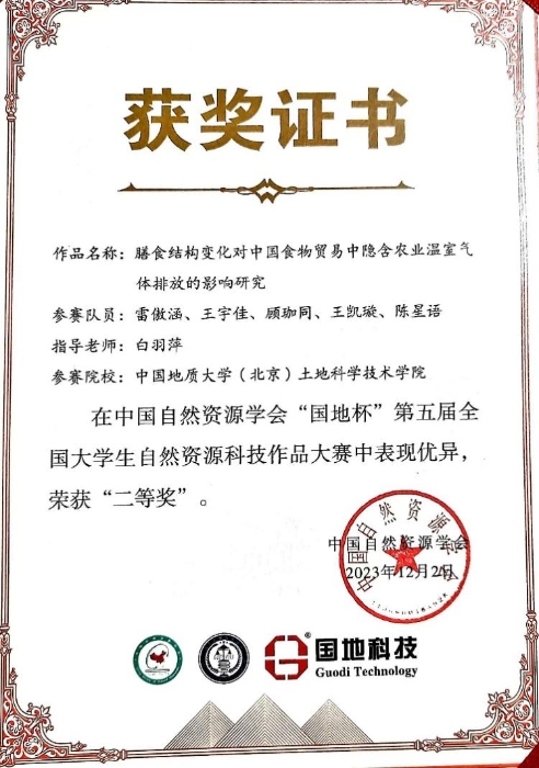 24、第五届全国大学生自然资源科技作品大赛,二等奖;指导教师:白羽萍,2023.12