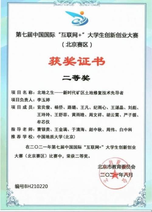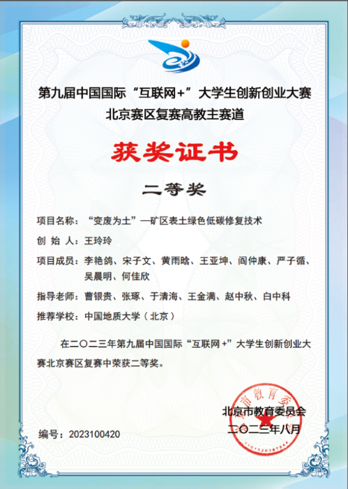 2、第九届中国国际“互联网+”大学生创新创业大赛北京赛区高教主赛道二等奖;指导教师:曹银贵、张琢、王金满、赵中秋、白中科,2023.08