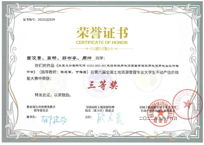 29、第六届全国大学生不动产估价技能大赛,三等奖;指导教师:张建军、付梅臣,2022.09