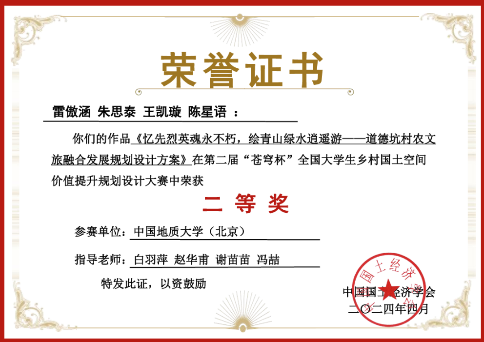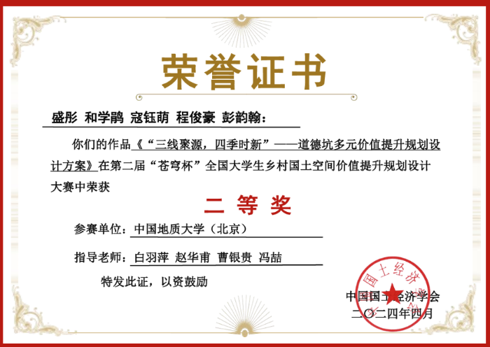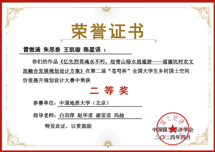 16、第二届全国大学生乡村国土空间价值提升规划设计大赛,二等奖;指导教师:白羽萍、赵华甫、曹银贵、冯喆,2024.04
