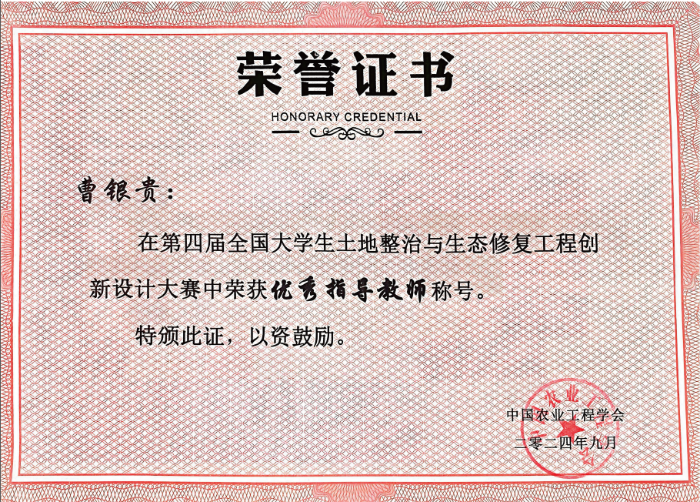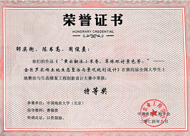 4、第四届全国大学生土地整治与生态修复工程创新设计大赛,特等奖;指导教师:曹银贵,2024.09