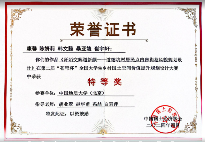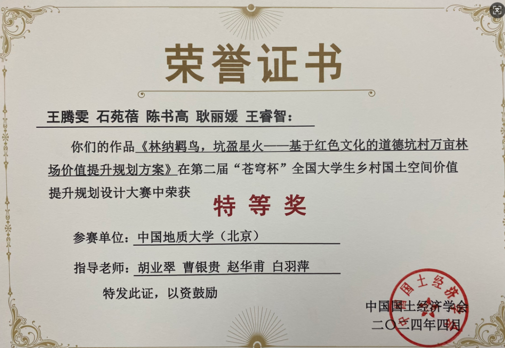 13、第二届“苍穹杯”全国大学生国土空间价值提升规划设计大赛,特等奖;指导教师:胡业翠、赵华甫、冯喆、白羽萍,2024.04