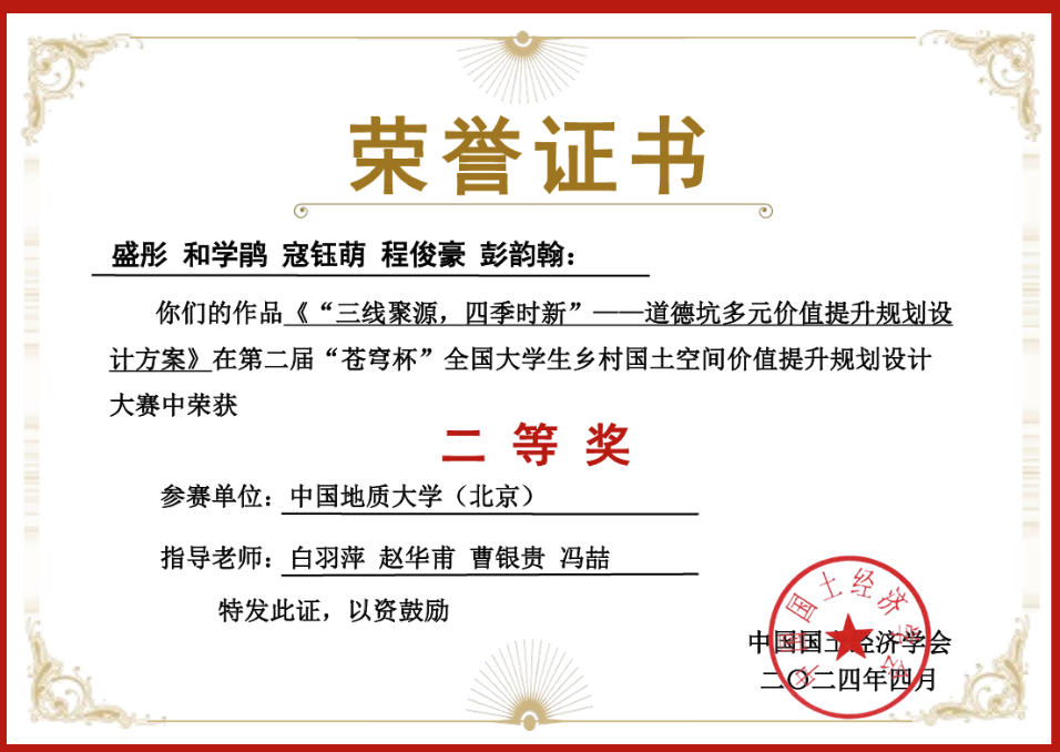 17、第二届全国大学生乡村国土空间价值提升规划设计大赛,二等奖;指导教师:白羽萍、赵华甫、谢苗苗、冯喆,2024.04