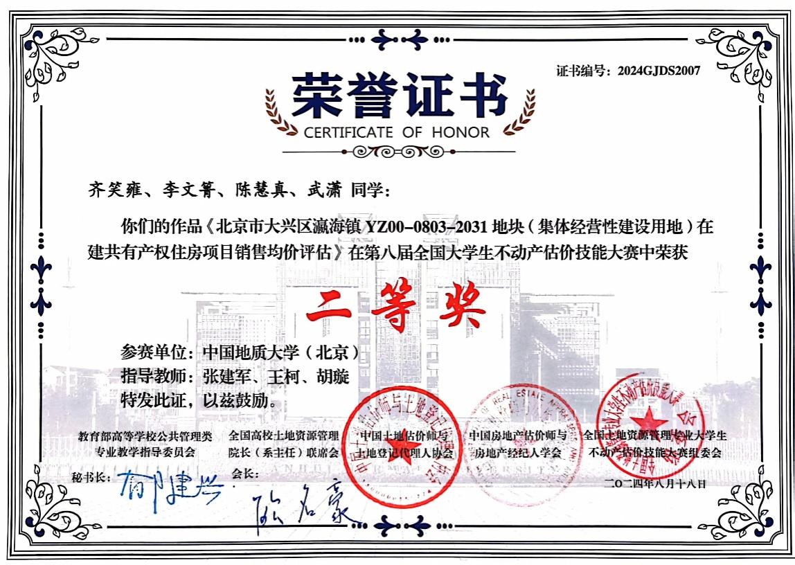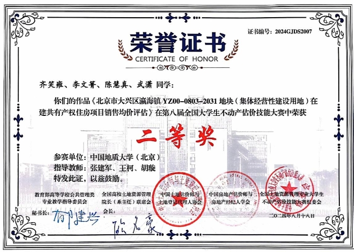 3、第八届全国大学生不动产估价技能大赛,二等奖;指导教师:张建军、王柯、胡璇,2024.08