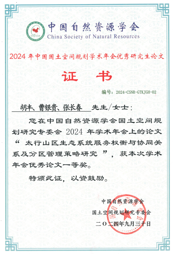 7、中国自然资源学会国土空间规划研究专委会学术年会优秀论文奖,一等奖;指导教师:曹银贵,2024.09
