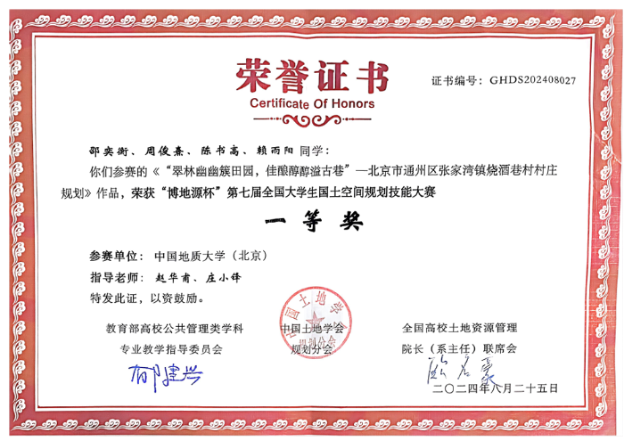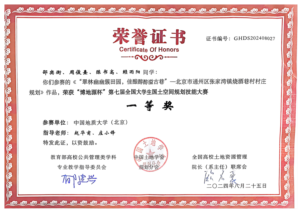 15、第七届全国国土空间规划技能大赛,一等奖;指导教师:赵华甫,2024.08