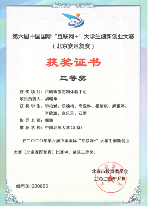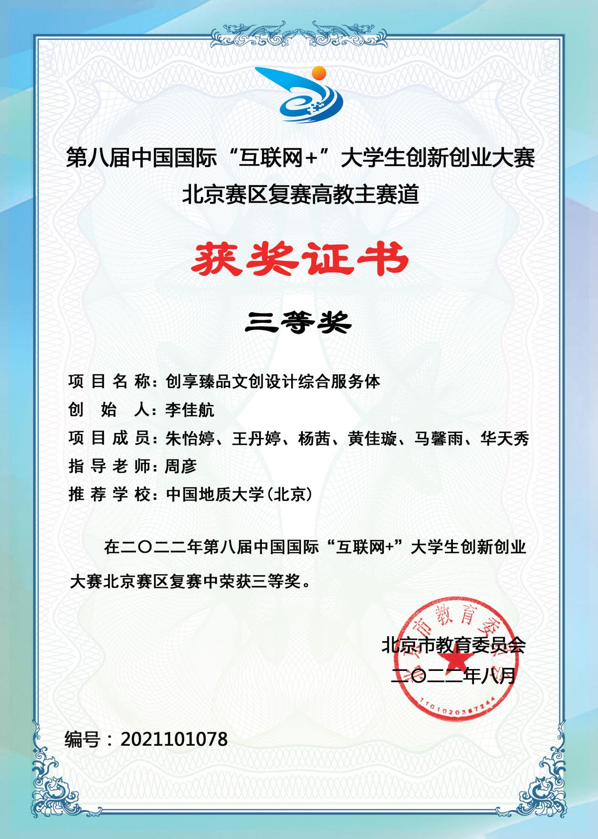 第八届中国国际“互联网+”大学生创新创业大赛北京赛区复赛高教主赛道三等奖
