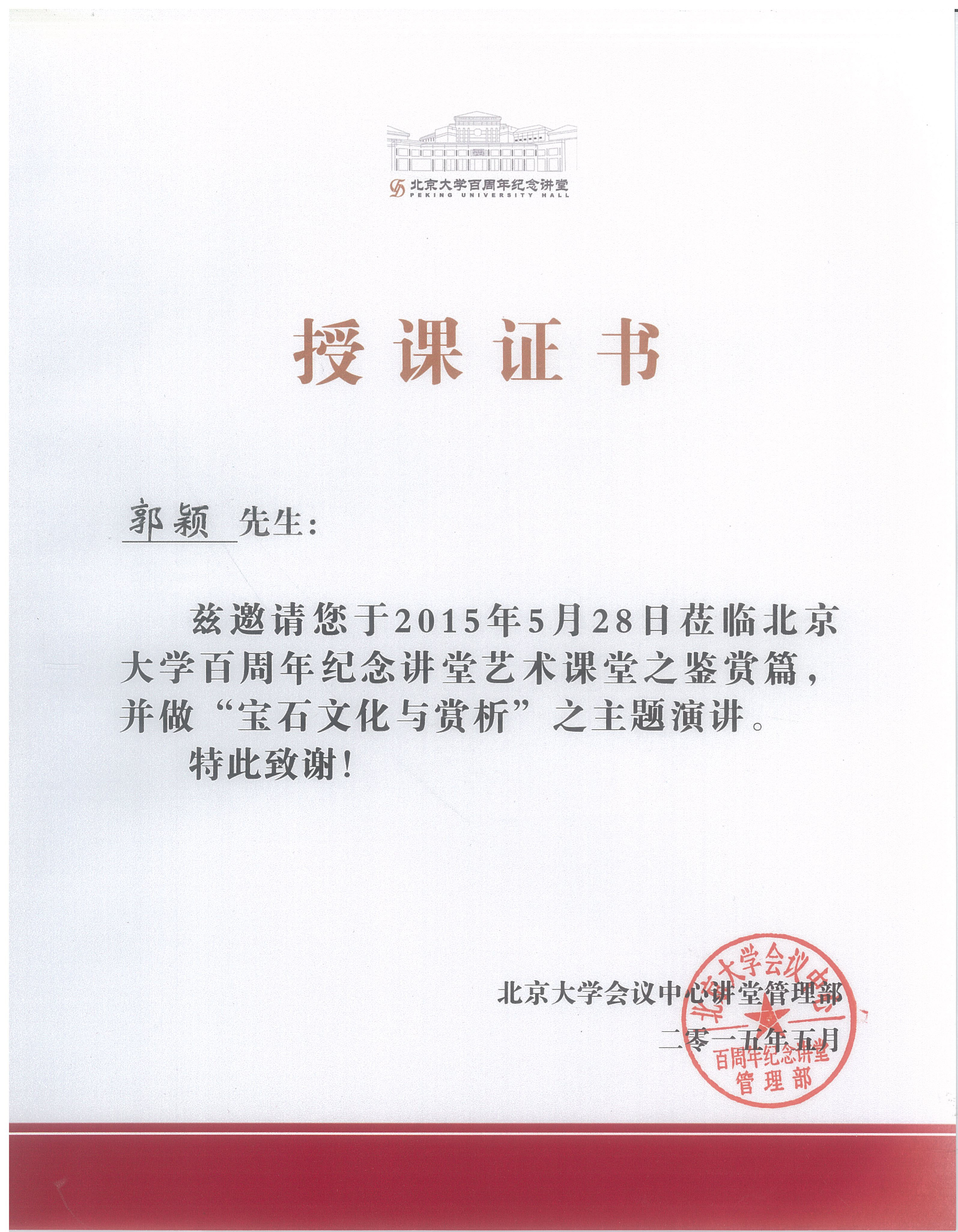 北京大学百年纪念讲堂 “宝石文化与赏析”授课证书