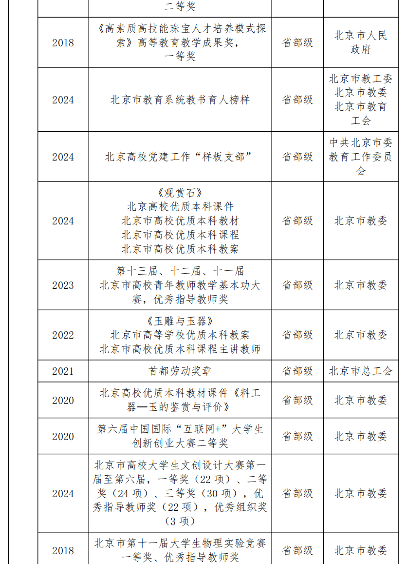 人才培养质量被广泛认可,全国珠宝类专业中高考录取分数连年第一。新建艺术与科技专业,宝石及材料工艺学获批国家一流专业、北京重点建设一流专业;建成省部级及以上课程6门、示范基地2个;45%的教师获国际职业资格,人才与团队奖20多项,出版教材专著33部;学生获省部级及以上文创设计奖30多项,国际职业证书200余项,发表高质量论文200多篇。创建了北京高校文创设计专业群、北京学院、北京市大学生文创设计大赛。