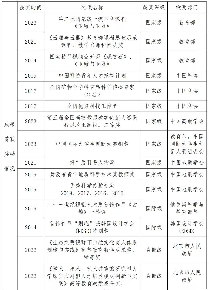 (1)艺工融合,培养模式做示范。统筹跨学科课程比例构建四元课程群矩阵,打破传统学科壁垒,深度融合宝玉石自然美与设计美、制作美,推动教学内容从单一技能培养向“美学感悟+技术实现”的复合型创新转变,近三年孵化创业项目20余项。一批中青年教师全国及省级教学竞赛中成绩优秀,获首批教育部课程思政名师、教学创新大赛国家级二等奖等,与国际10余所著名大学和20余家机构建立了良好合作关系。五维协同的产教融合学训一体化长效机制,引领全国珠宝玉石首饰行业产教融合共同体同类高校的技术研发与产业需求精准对接。成果广泛应用到理工科基础应用型专业人才培养中,为河北地质大学、昆明理工大学等20余所大学教育教学改革的提供了示范。