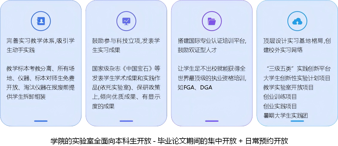 师资接轨国际:实施“国际师资提升计划”,全额资助青年教师考取英国宝石协会(GEM-A)FGA(宝石鉴定师)、DGA(钻石分级师)国际职业资格证书,近三年15名教师获国际资格认证,邀请国际珠宝设计师、检测专家开展线上线下讲座15场,覆盖学生1200余人次。