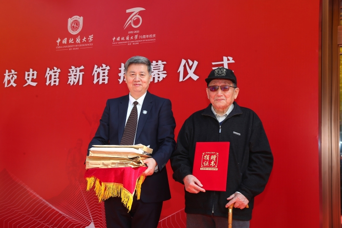 仪式上,校长孙友宏院士向首批校史顾问团成员帅开业、胡轩魁、陈宝国、陈晦鸣、陈秀珍、朱广玲、王惠玲、李娜等人授予聘任证书,并代表学校接受了张桂珍老师捐赠的大庆“铁人井生产的石油”水晶纪念品、曾学鲁老先生捐赠的北京地质学院早期使用的罗盘和苏制照相机等物品及李东旭老先生捐赠的地质力学专业筹建以来的全套资料。