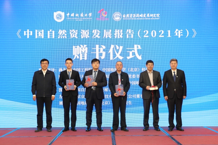 会上,中国工程院原副院长干勇院士,自然资源部原国土资源部党组成员、中国地质调查局原局长孟宪来,中国工程院能源与矿业工程学部原主任苏义脑院士、彭苏萍院士与我校校长孙友宏院士共同启动发布了《中国自然资源发展报告(2021年)》的发布。校长孙友宏院士与中国大地出版传媒集团有限公司党委书记、董事长顾晓华分别为中国地质图书馆领导、学会代表、企业代表和学生代表赠书。战略院副院长葛建平对《中国自然资源发展报告(2021年)》主要研究成果进行介绍。原国务院参事室原参事、中国地质大学(北京)自然资源战略发展研究院首任院长张洪涛主持《中国自然资源发展报告(2021年)》发布环节。