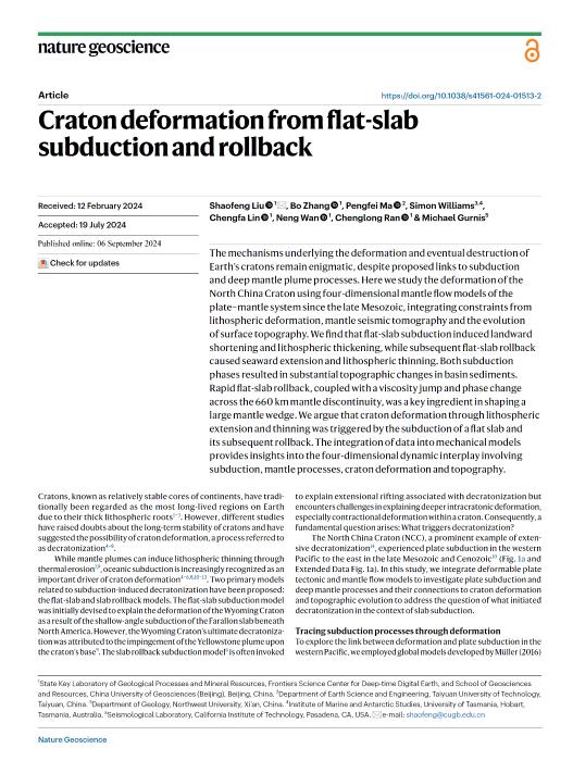 刘少峰教授团队在《Nature Geoscience》发表板块俯冲与克拉通变形耦合机制的最新研究成果