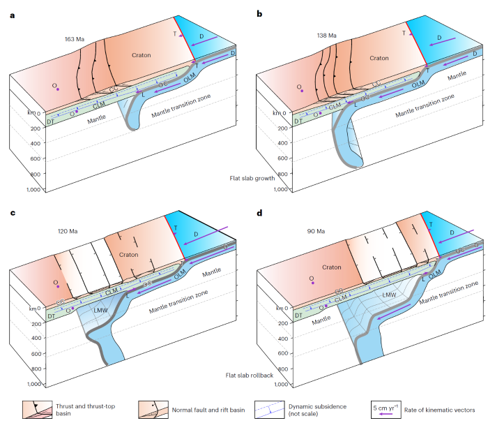 克拉通作为地球上最古老且相对稳定的大陆核心区域,因其厚实的岩石圈根部,历来被视为地球上保留最为持久且难以破坏的区域。然而,近年来的研究对克拉通的长期稳定性提出了质疑,指出了克拉通发生变形的可能性。什么引发了克拉通的变形与破坏是一个亟待解答的核心基础科学问题。为了解答这一问题,研究团队整合了岩石圈变形、地震层析成像及地表地形演化等多种约束,并利用板块-地幔系统四维地幔流动模型对华北克拉通变形进行了系统研究。研究发现,平板俯冲导致岩石圈收缩和加厚,随后平板回撤引发岩石圈的伸展与减薄,进而影响地表地形的变化。快速的平板回撤,伴随着660公里深度地幔不连续面处的黏度跳变和相变,是大地幔楔形成的关键因素。大洋板片的平板俯冲及回撤不仅引发了岩石圈伸展和减薄,还导致克拉通的破坏。该研究结合了地质大数据与动力学模型,为板块俯冲、地幔过程、克拉通变形与地形之间的复杂动力相互作用提供了新的见解。